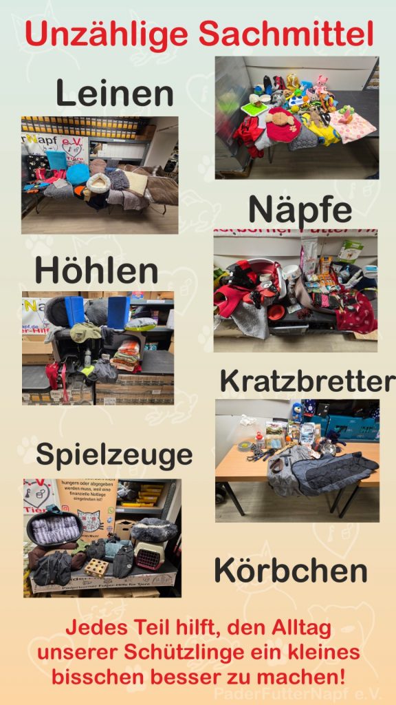68 tierärztliche Maßnahmen, ca. 15 Tonnen Futter, 3,5 Tonnen Katzenstreu und unzählige Sachspenden wie Leinen, Näpfe, Körbchen, Kratzbretter und Spielzeuge.