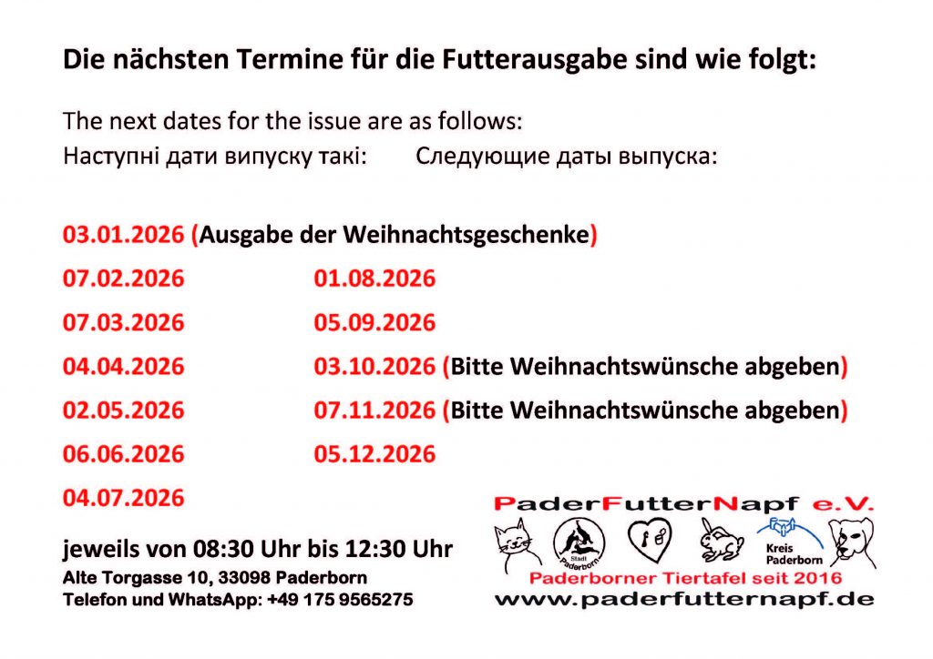 Unsere Futterausgabe findet auch 2026 wieder einmal im Monat statt – immer am 1. Samstag im Monat jeweils von 08:30 bis 12:30 Uhr in der Alten Torgasse 10, 33098 Paderborn.