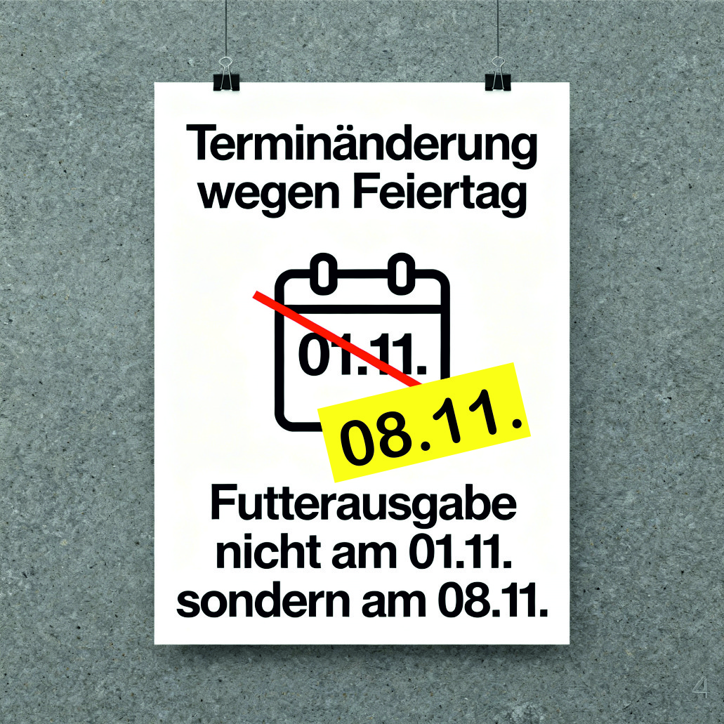 Wegen dem Feiertag am 01. November findet an diesem Tag keine Futterausgabe statt.